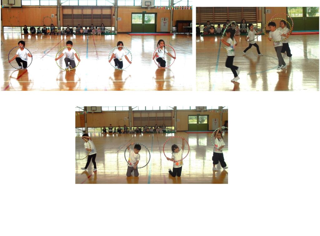 エンディングはひまわり組のフラフープダンスです。腰回しに縄跳び、フープ交換に挑戦しました。緊張の中、1秒でも長く回したい!と日頃から練習した成果を発揮し、集中した表情が印象的でした。