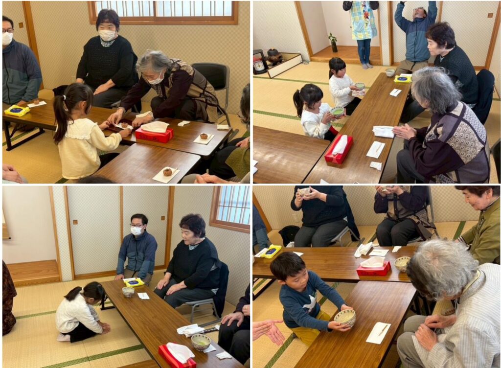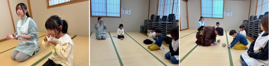 お茶会では、「お茶の歩き方」…すり足 「お茶の立ち方、座り方」…正座 や立つ前につま先を立てて腰を下ろすなど、茶道の所作や『おもてなしの心』にふれています。