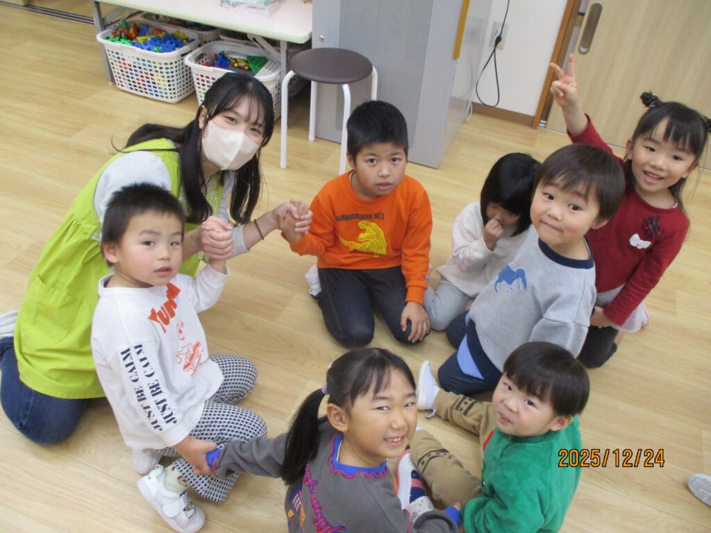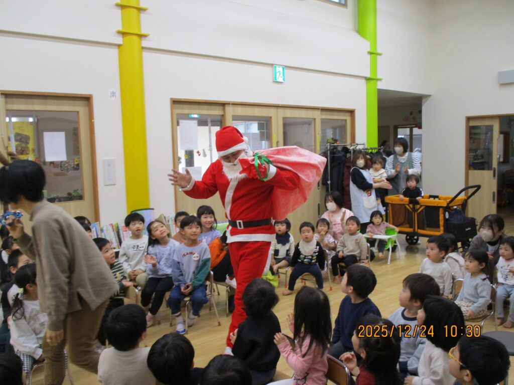 最初はサンタさんの登場にびっくりした子もいましたが、優しそうなサンタさんの笑顔を見て、皆もにこにこ笑顔になりました♪