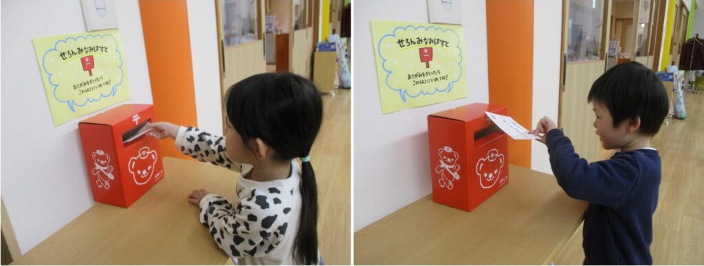 そんな今日この頃、「先生、年賀状もらったことがあるんだけど、私もお手紙書いてみたい!郵便ポストに入れてみたい!」というリクエストがあり、年長児ひまわり組が中心となってお手紙遊びが始まりました。