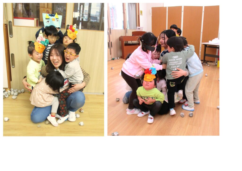 2~5歳児クラスはホールで豆まきごっこを楽しみました。大きな鬼の的に新聞紙で作った豆を投げたり、カラフルで可愛らしい鬼さんと一緒に写真撮影もしました。