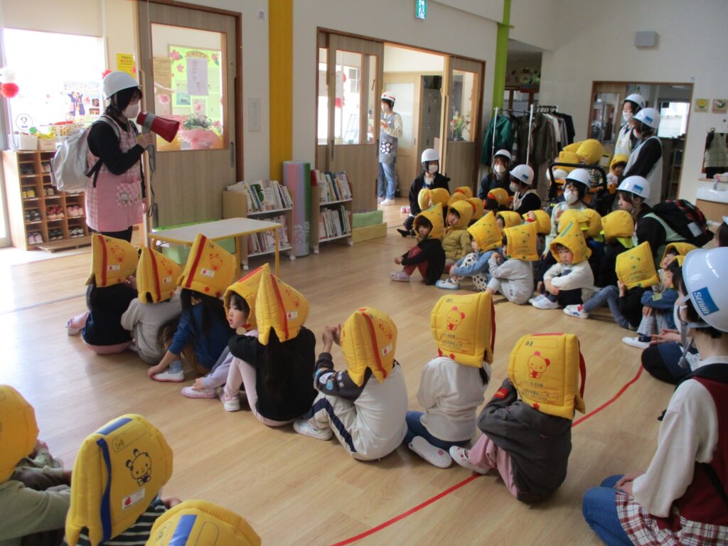 10時10分頃にサイレンが鳴ると、園全体に放送が流れます。地震を想定にした訓練です。