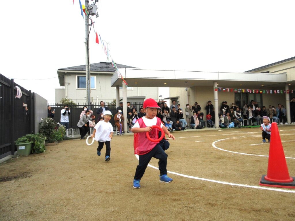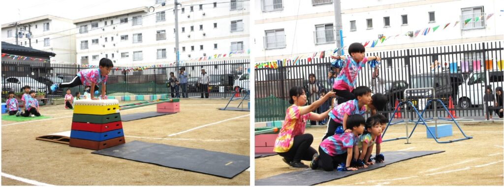 当日は曇り空で不安定な天気でしたが、子ども達は朝から気合十分の表情。オープニングを飾ってくれたのは、5歳児ひまわり組です。日々の保育の中で跳び箱や鉄棒、はしご渡りなどの運動遊びを十分に楽しみ、チャレンジしてきました。本番では今まで積み重ねてきたことを発揮できた瞬間でしたね。