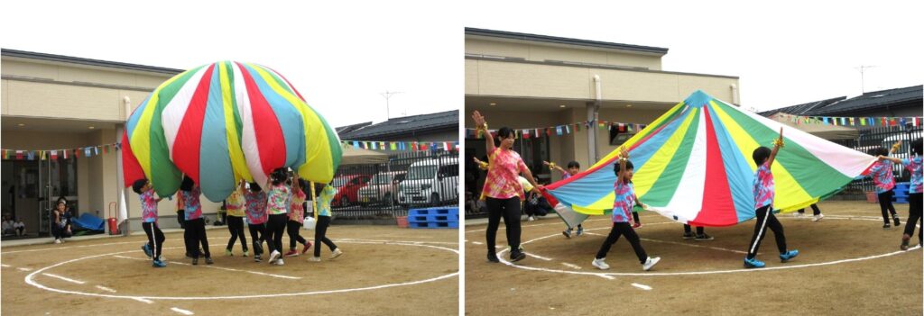 次は5歳児ひまわり組のパラバルーン。息の合った技が次々と決まり大成功☆とてもかっこよかったです!皆と力を合わせることの楽しさや大切さを経験し、自信に満ちあふれた頼もしい横顔に涙がこみ上げてきました。
